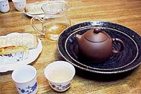 お茶は質が良くて、お値段もリーズブルです。 *自宅でのお茶風景。茶海(写真奥)は後日かっぱ橋でゲット。茶池もどきのお皿はもともと自宅にあったもの。 |