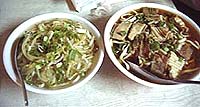 (空いているお店は怪しいとみた) 左:搾菜肉絲麺 (小)40元 テーブルに置いてある、野沢菜と豆板醤は食べ放題。 |