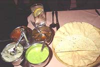 お店の名前はTaste of India。 ”インドの味”ってやつだね。←そのままや〜 雑誌によく載っているのでインド料理では有名な店らしいです。 テーブルセッティングもちゃんとしてるので、正装して食べたいお店ですが、料金はそれほど高くない。 イギリス人の家族がこれからミュージカルを見に行くのか、ドレスアップして来てました〜 ミュージカルを見る前に食べると思われる、 Pre-Theatre Set£8.25(約1400円)を頼んでみました。 | |