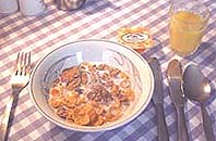 | 朝食はフル・イングリッシュブレックファーストでした。 まず、ジュースとシリアル&フルーツ(ドライフルーツ)をセルフで取ります。 そのうち宿の人がディッシュとトーストを持ってきてくれます。 嫌いなものは前持って言っておけばちゃんと省いてくれます。 |